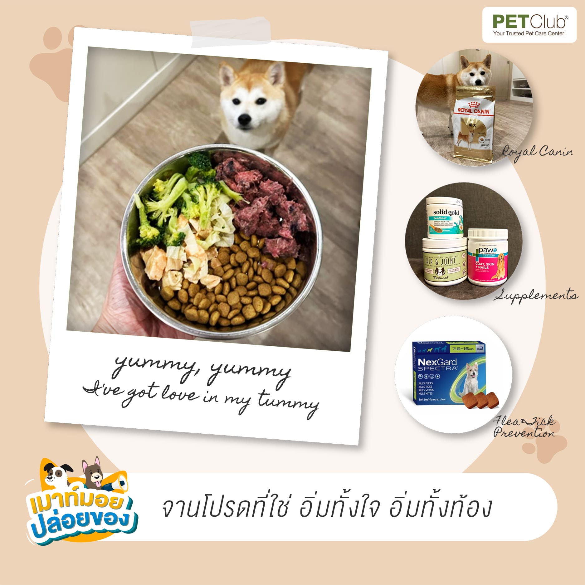 ช่วงนี้สมส่วนทานอาหารเม็ด Royal Canin สูตรเฉพาะของชิบะ ผสมกับผัก (บรอกโคลี่ แครอท ถั่ว และ โปรตีน เช่น ไข่ อกไก่ ปลาแซลม่อน) สลับๆกันไป ค่ะ