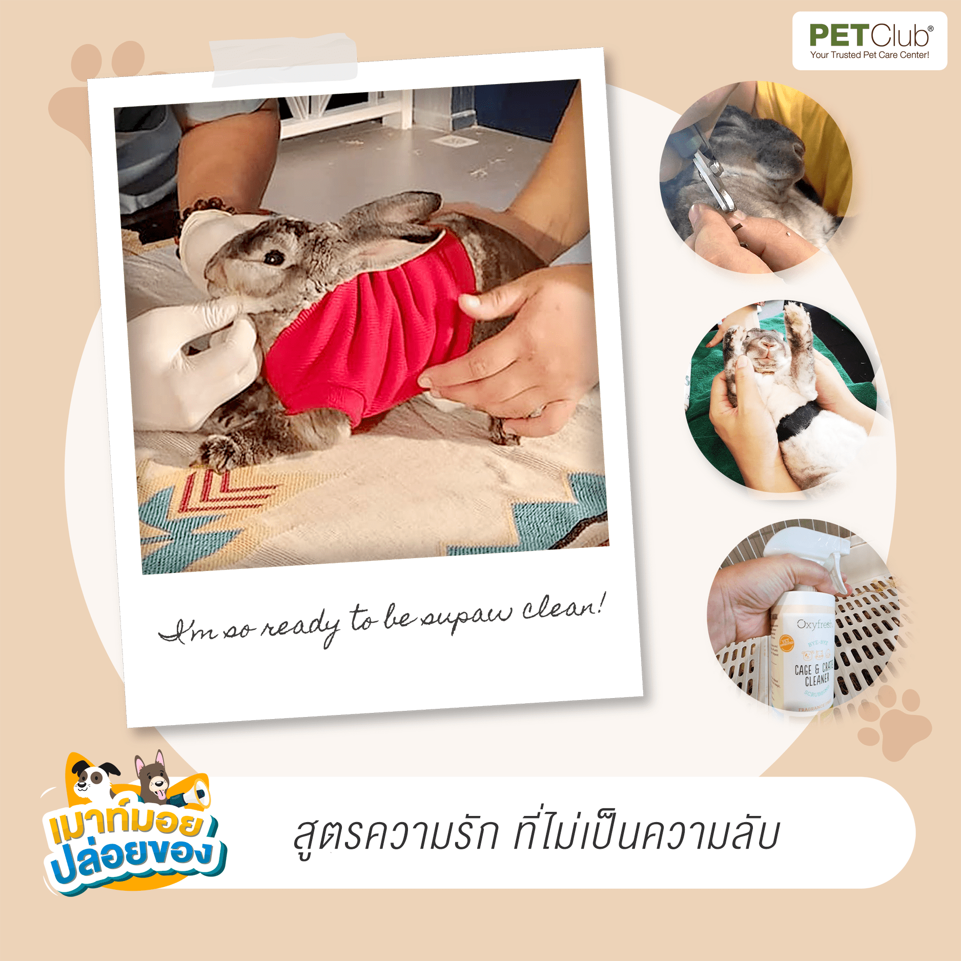 ส่วนการดูแลทั่วไปก็แปรงขน ตัดเล็บ เราช่วยกันทำเองค่ะ โชคดีที่กระต่ายเขาจะคล้ายแมวคือเลียทำความสะอาดตัวเอง ถ้าเลอะไม่มากก็จะใช้ผ้าเปียกเช็ด หากเลอะจริง ๆ หรือเจอกลิ่นไม่พึงประสงค์ถึงใช้โฟมแห้งทำความสะอาดให้น้องค่ะ