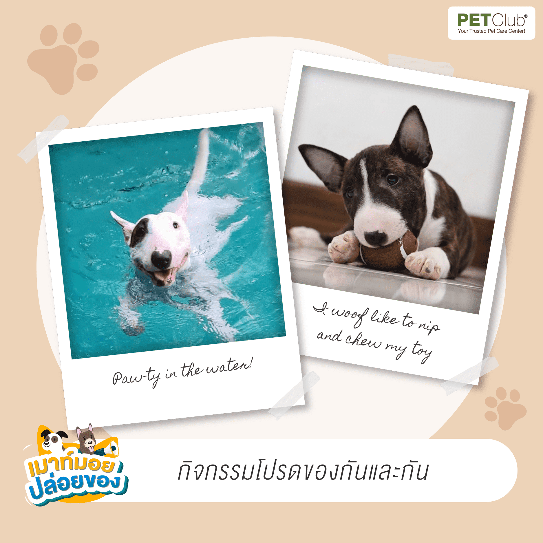 A: เริ่มต้นจากที่บ้านเลี้ยงสุนัข แล้วเราก็โตมาแบบมีสุนัขเป็น companion ด้วยมาตลอด จนวันนึงเราโตขึ้น รับผิดชอบ-พร้อม มากขึ้น เราหาข้อมูลเกี่ยวกับสายพันธุ์ที่ชอบ ลองดูหลาย ๆ พันธุ์ แล้วก็มาสะดุดที่ Bull Terrier / Miniature Bull Terrier ค่ะ ตอนนี้ลาเต้ (เพศเมีย) จะ 7 ขวบ แล้ว, โกโก้ (เพศเมีย) 1 ขวบนิดหน่อย, ซินนาม่อน (เพศผู้) จะครบ 4 เดือนค่ะ