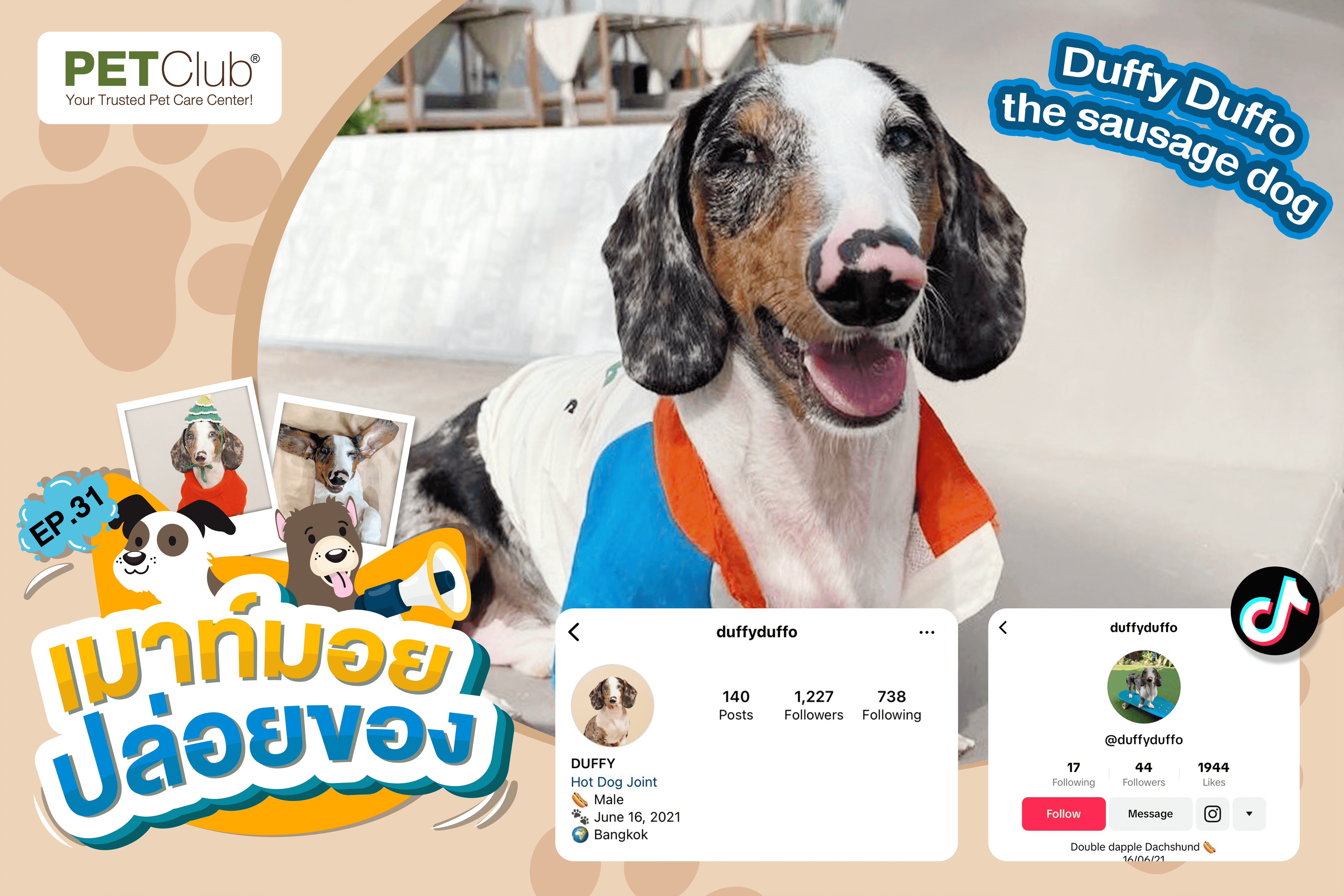Friday night นี้พาทุกคนมาพบกับหนุ่มน้อยดัฟฟี่ Dachshund Double Dapple ที่จะมาตกชาว PETClub ให้หลงไปกับความน่ารักของน้อง ใครที่ชอบเจ้าหนูดุ๊กดิ๊กตัวนี้ ก็สามารถไปติดตามน้องได้ที่ IG: duffyduffo และ Tiktok: duffyduffo