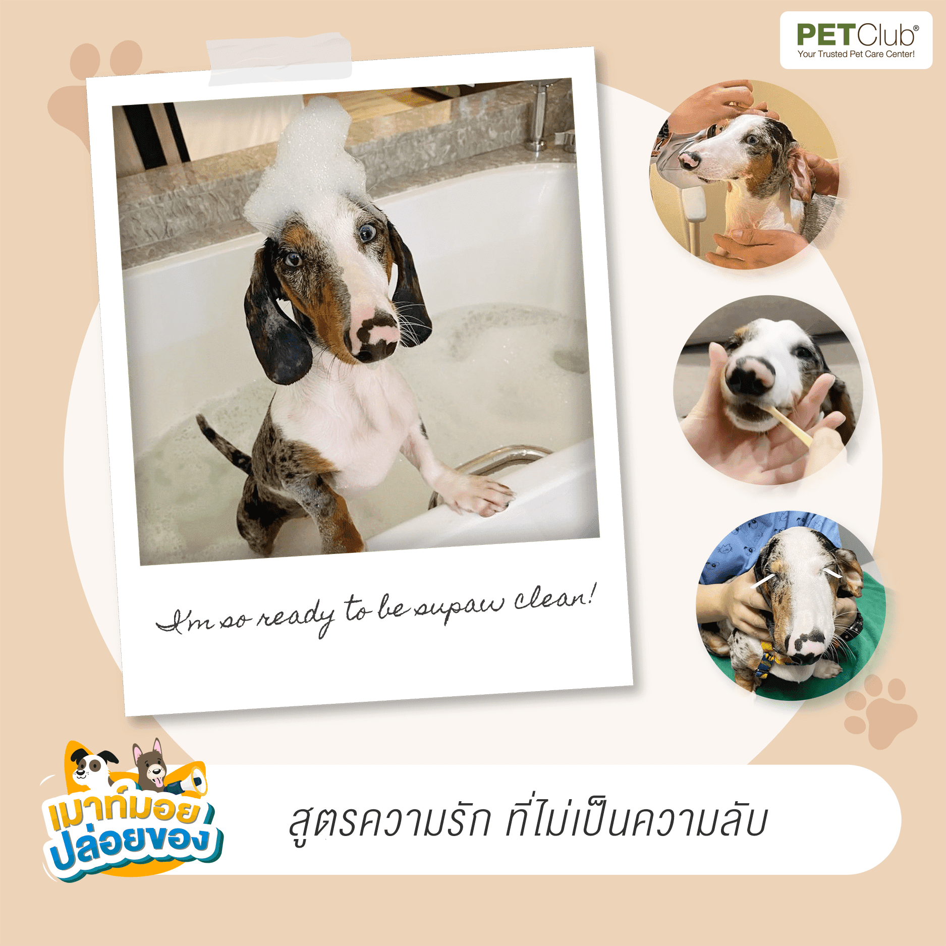 A: น่าจะทำเหมือนทุก ๆ บ้าน อาบน้ำ แปรงฟัน ตัดเล็บ เช็ดหู ตามปกติเลย ดัฟฟี่เป็นหมาที่พิการตั้งแต่เกิดเพราะน้องเป็น Double Dapple มีปัญหาสุขภาพอยู่เรื่อย ๆ ค่ะ ตอนนี้หาหมอผิวหนัง 2 สัปดาห์ครั้งค่ะ หมอสมองทุก 3 เดือนค่ะ