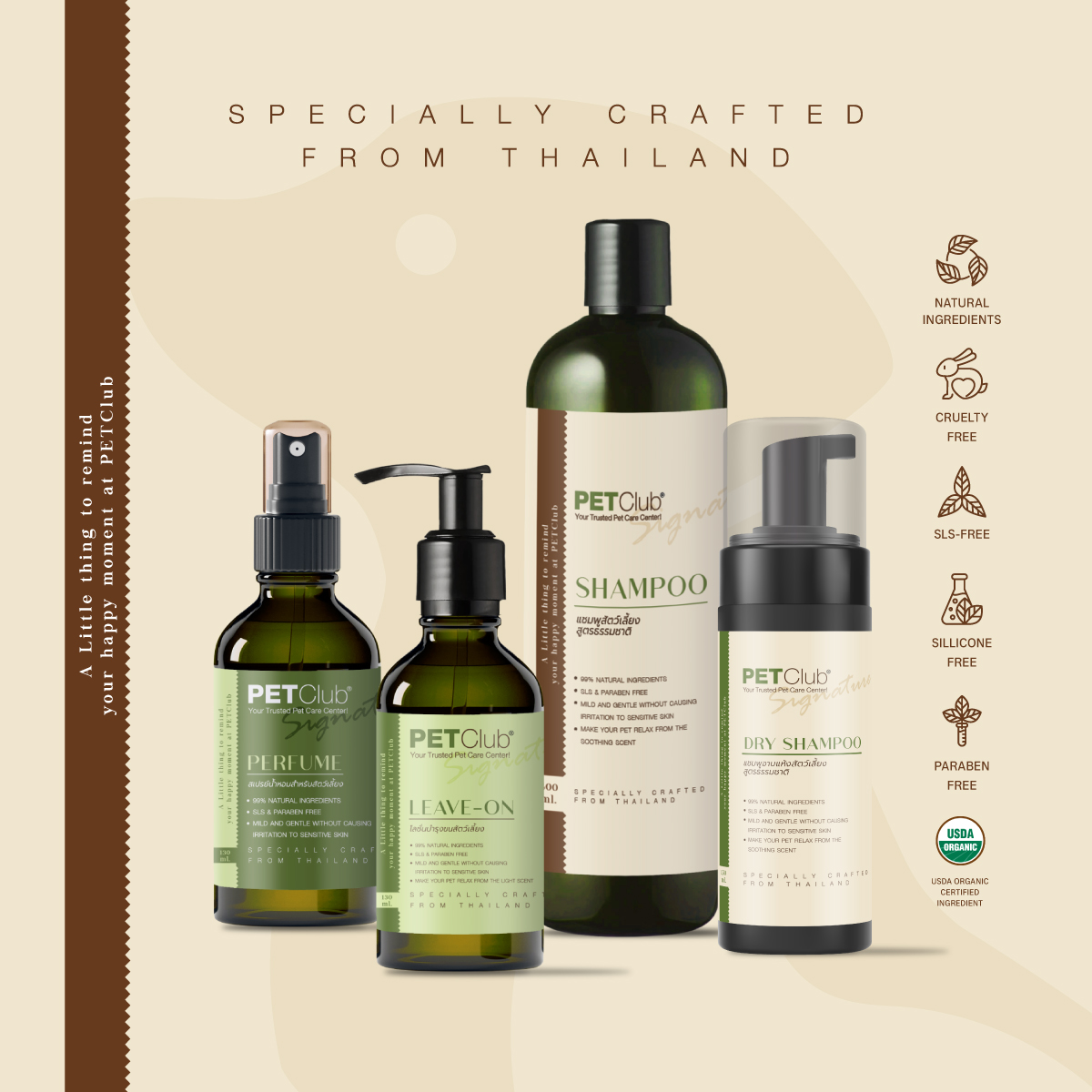 PETClub has developed its own line of grooming products under the PETClub Signature Set, created by our team of veterinarians and pet skincare specialists. This complete set includes: